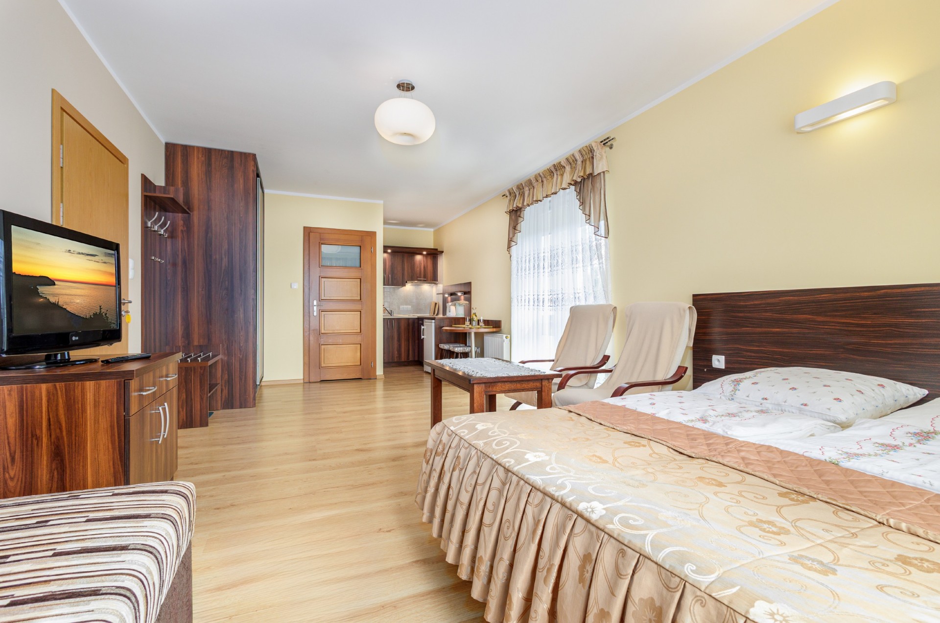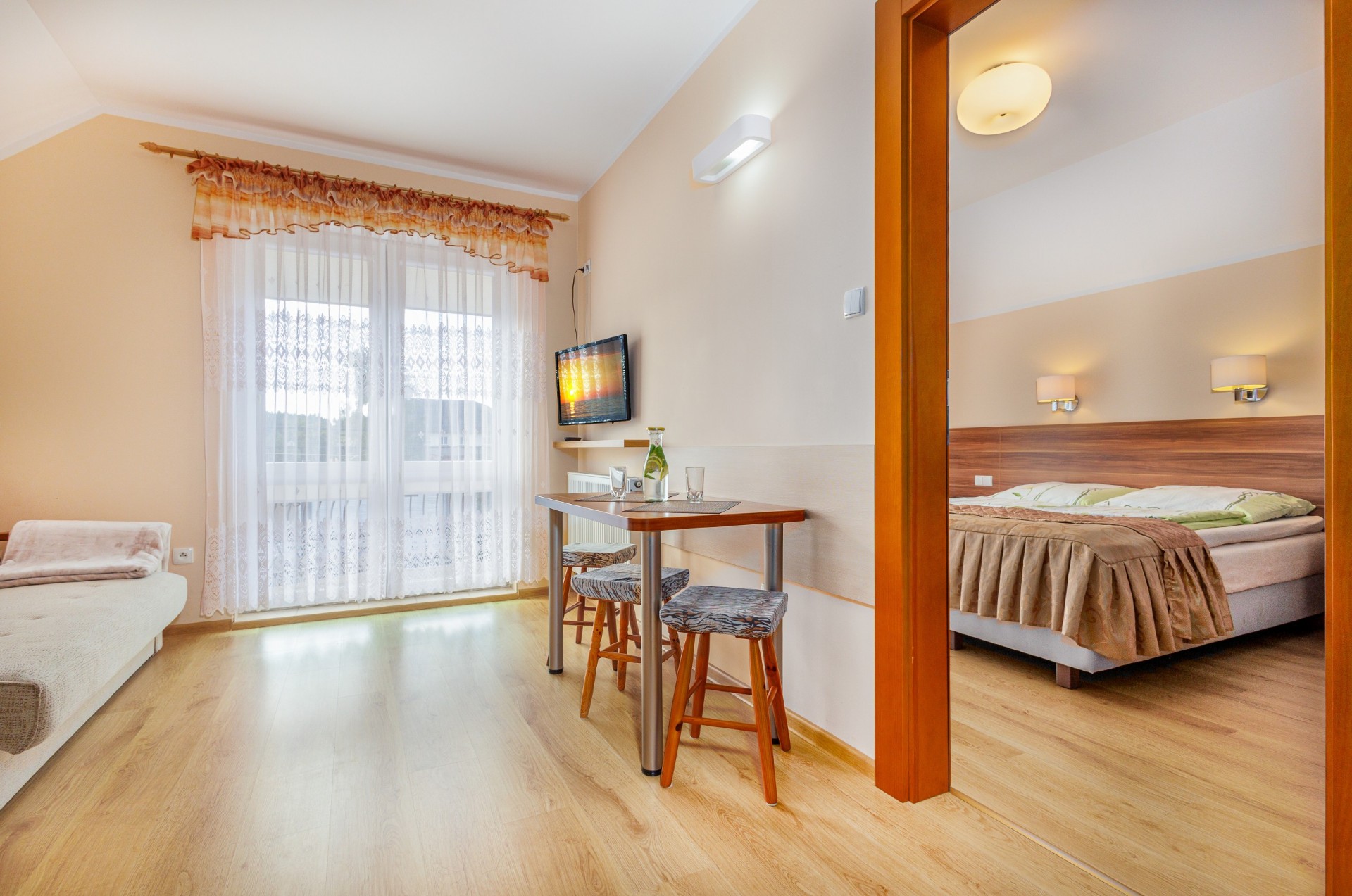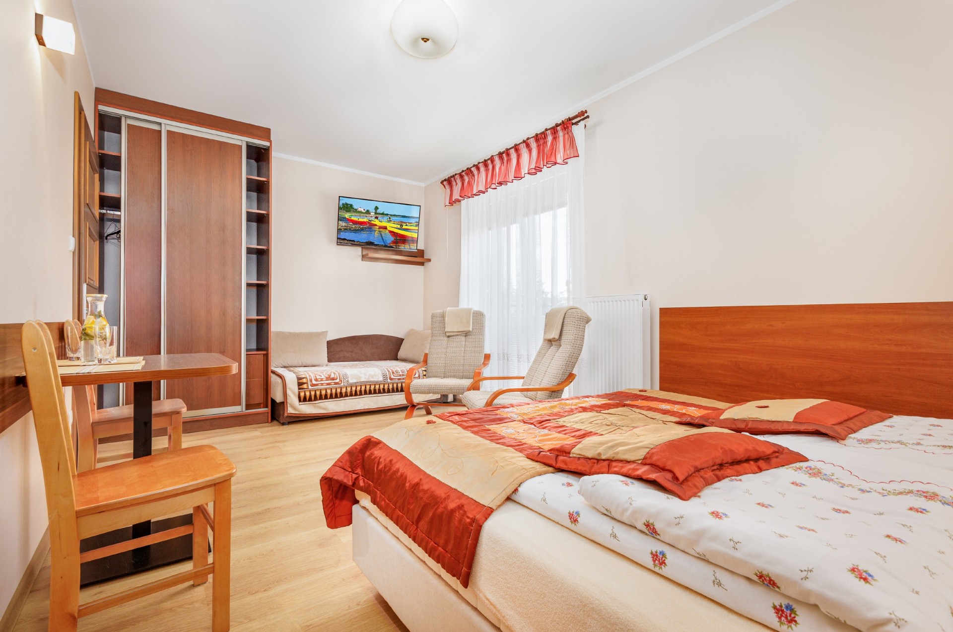 Przestronne, jasne pokoje zostały wyposażone w łazienkę, telewizor, lodówkę. Część pokoi posiada balkony.