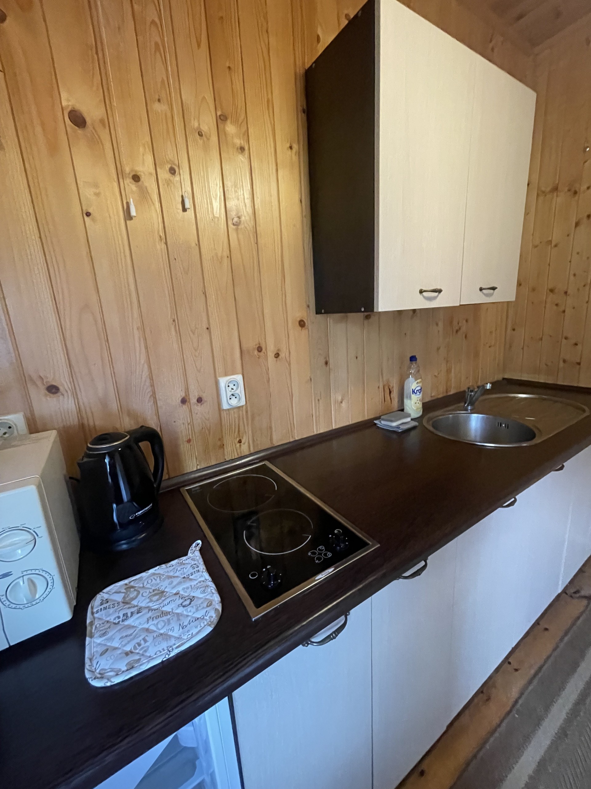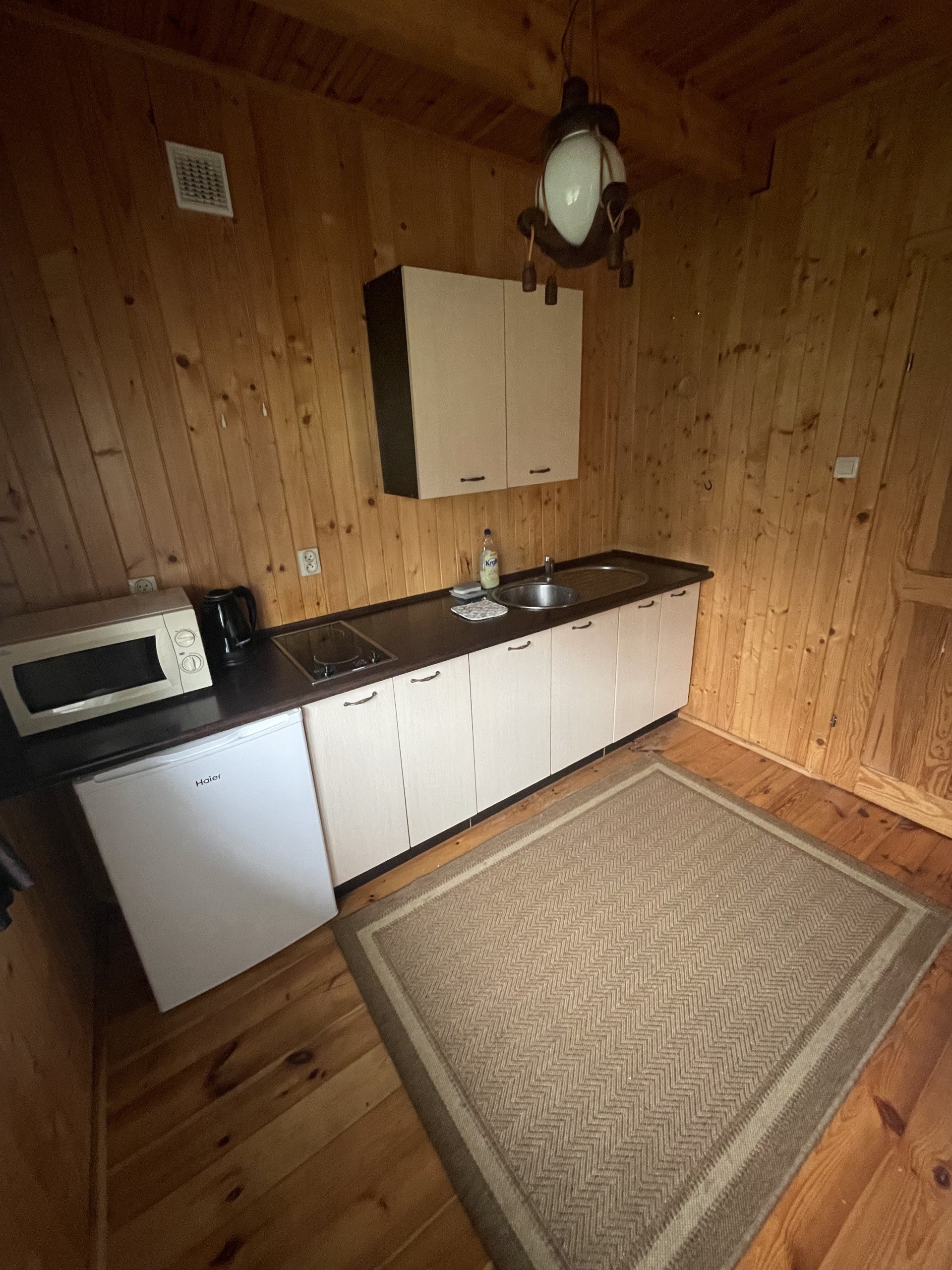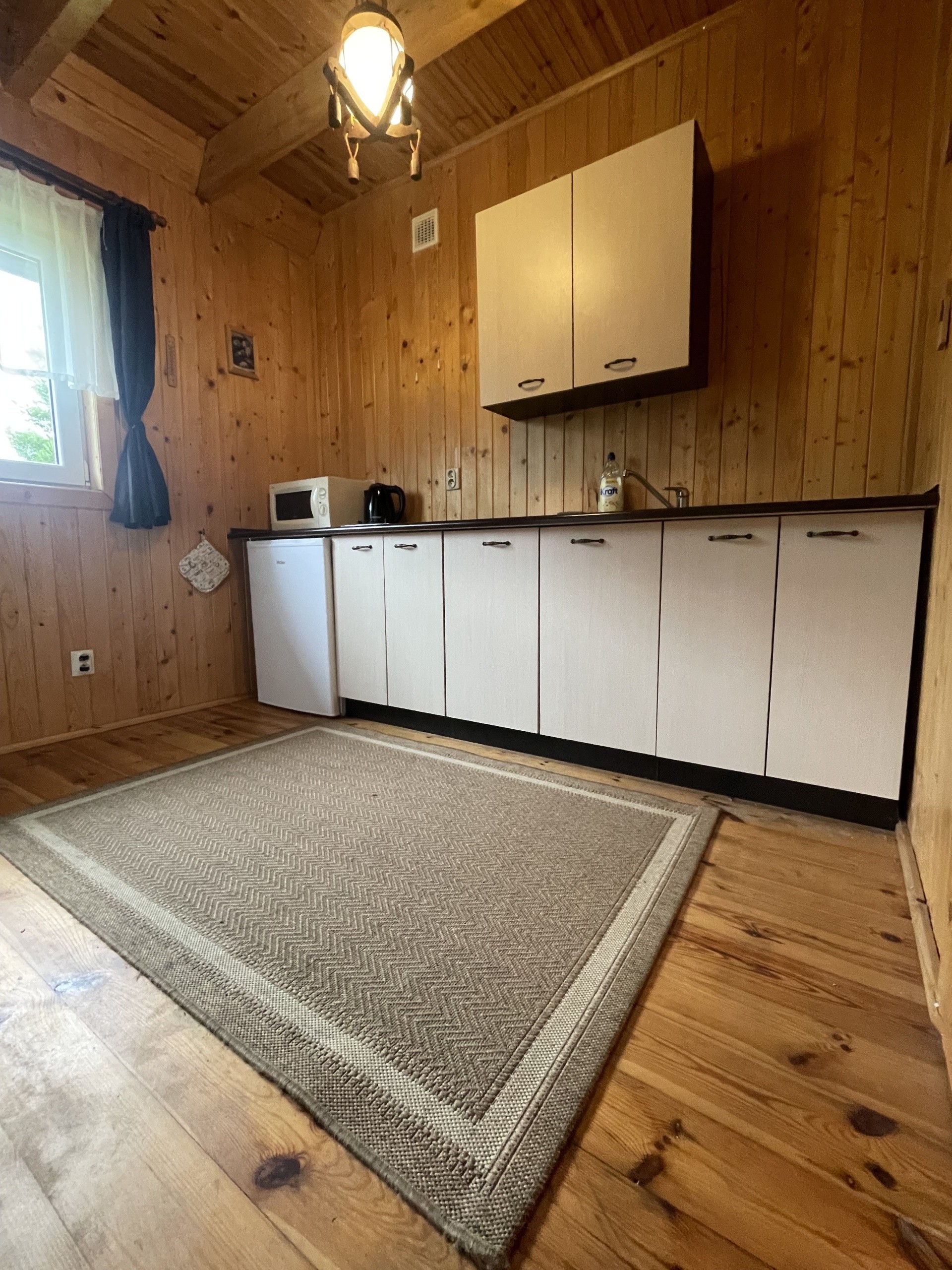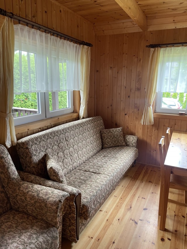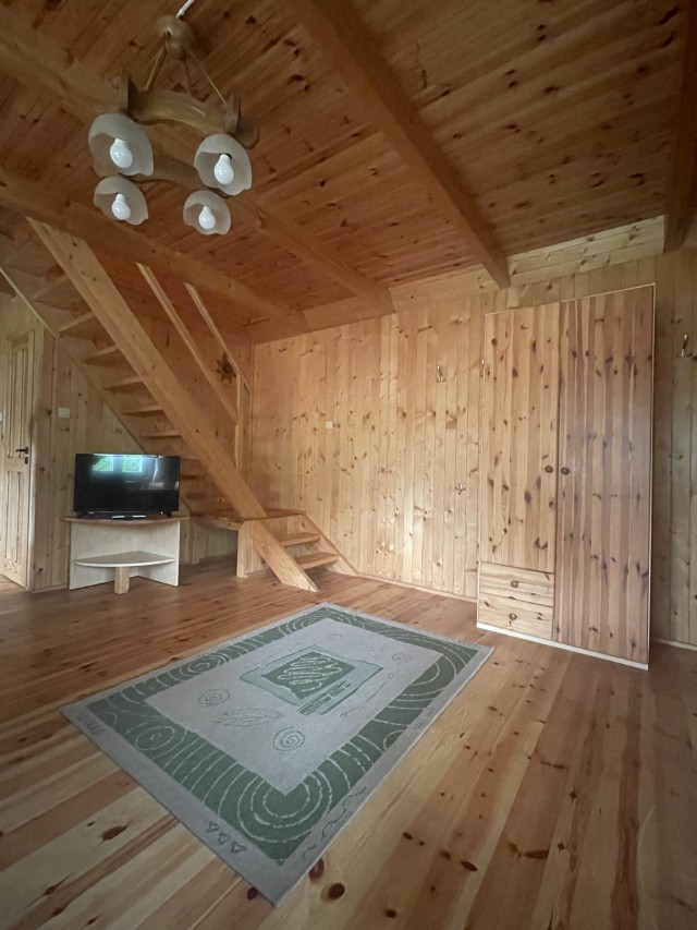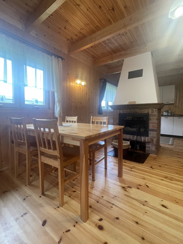 Domki piętrowe, na górze dwa pokoje (2 i 4 osobowe), na dole duży salon z kanapą rozkładana i kominkiem, kuchnia w pełni wyposażona m.in. lodówka , kuchenka mikrofalowa, płyta ceramiczna dwupalnikowa, czajnik elektryczny itd