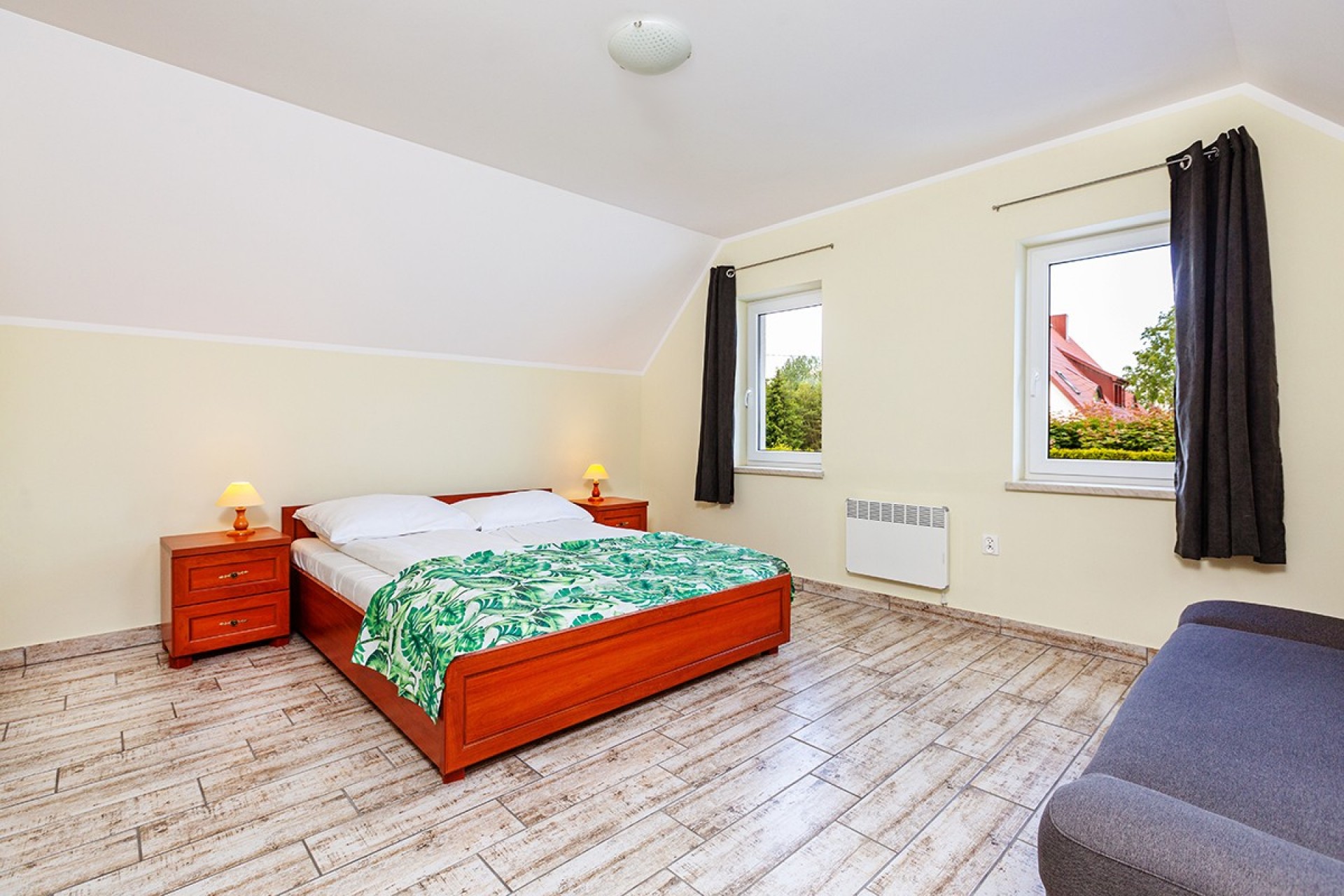 Na piętrze znajdują się sypialnie. Jedna wyposażona jest w łóżko małżeńskie oraz wersalkę, lamki i stoliki nocne, komodę i szafę.