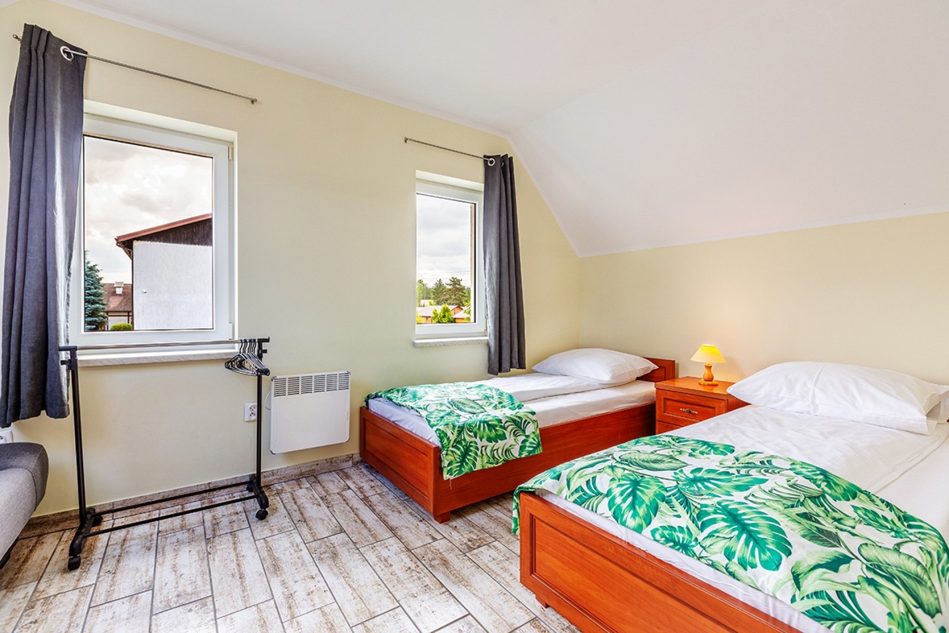 Druga posiada dwa łóżka oraz wersalkę, szafkę i lamkę nocną oraz komodę.