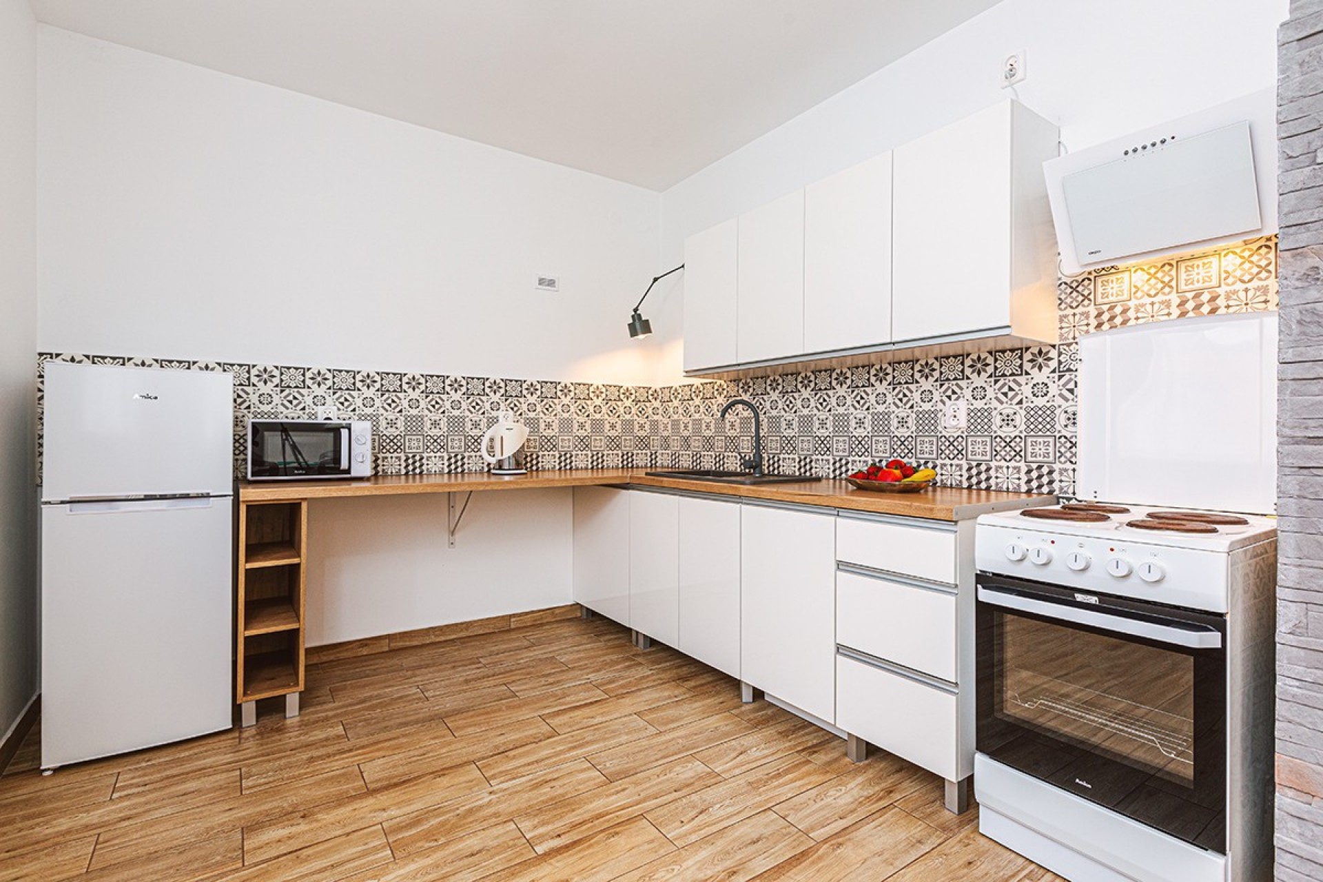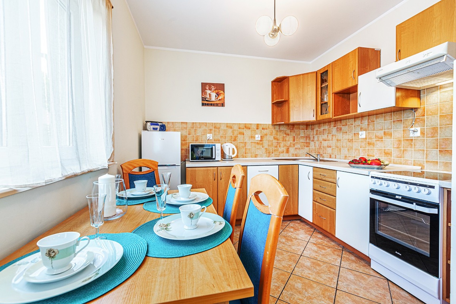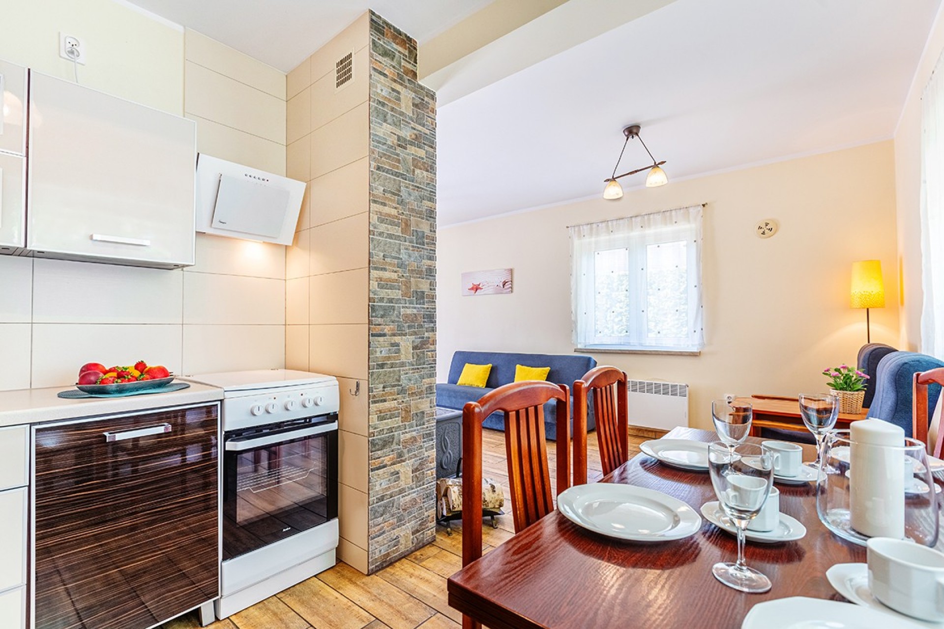 Na parterze znajduje się łazienka z prysznicem, w kuchni lodówka, kuchenka z piekarnikiem, zmywarka, komplet garnków, czajnik elektryczny, zestaw naczyń i sztućców, stół z krzesłami.